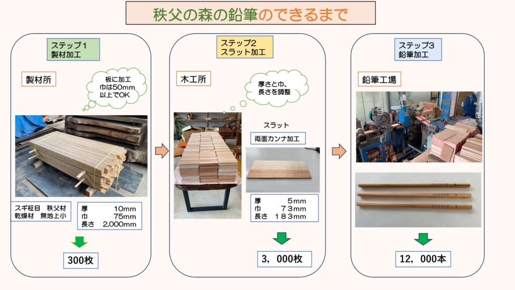 県東部には鉛筆を製造する工場が4社あることが分かり、秩父の森から生産されるスギの間伐材で鉛筆ができないかの検討を開始しました。