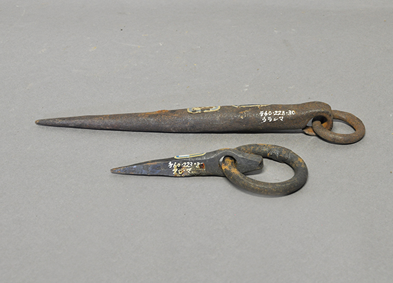 丸太に打ち込み、環の部分に縄をかけて木材を運搬するために使用する金具。